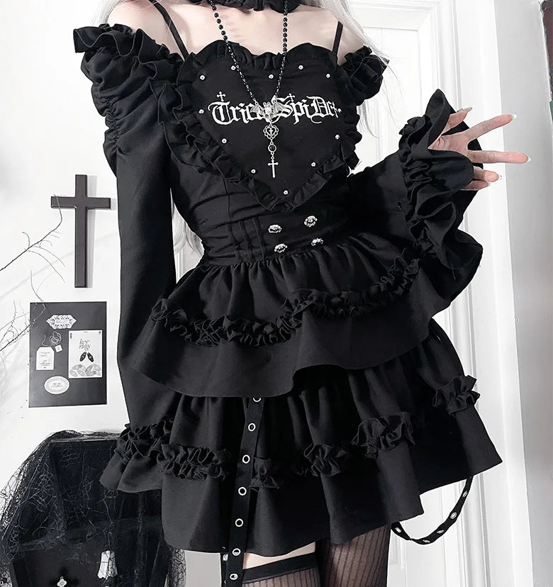 Abito Gotico Nero Vittoriano con Volant e Maniche Lunghe L