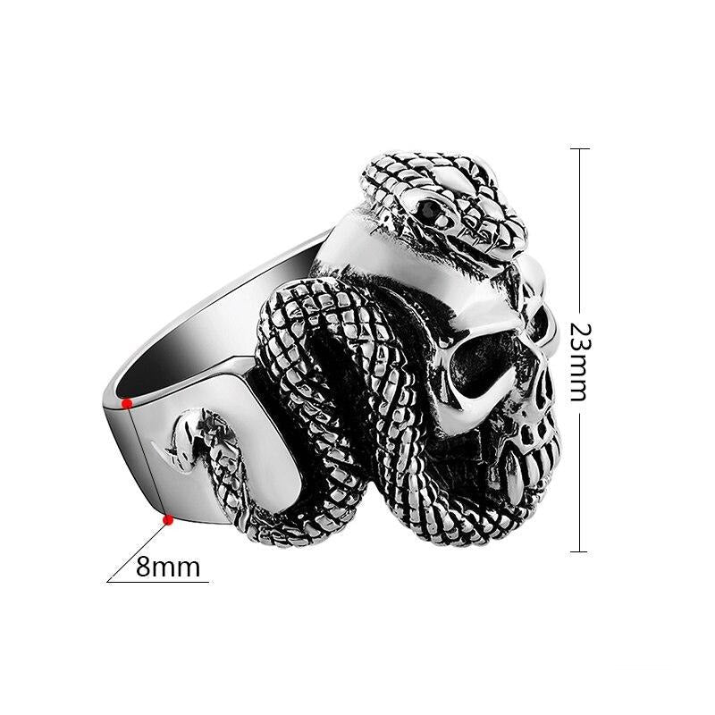 Questo anello è stato modellato e scolpito con cura per mettere in risalto un teschio e un serpente. Questi due simboli significano: