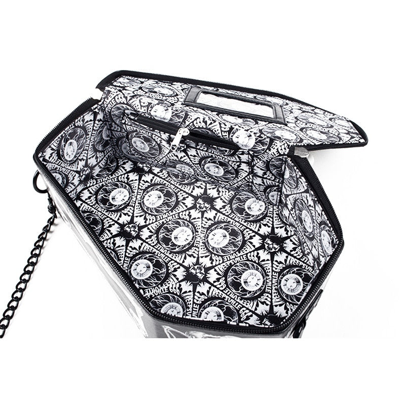 Oltre alla sua estetica unica, la borsa gotica bara svolge anche la sua funzione principale, che è quella di tenere le tue cose al sicuro. Pertanto, è dotata di: