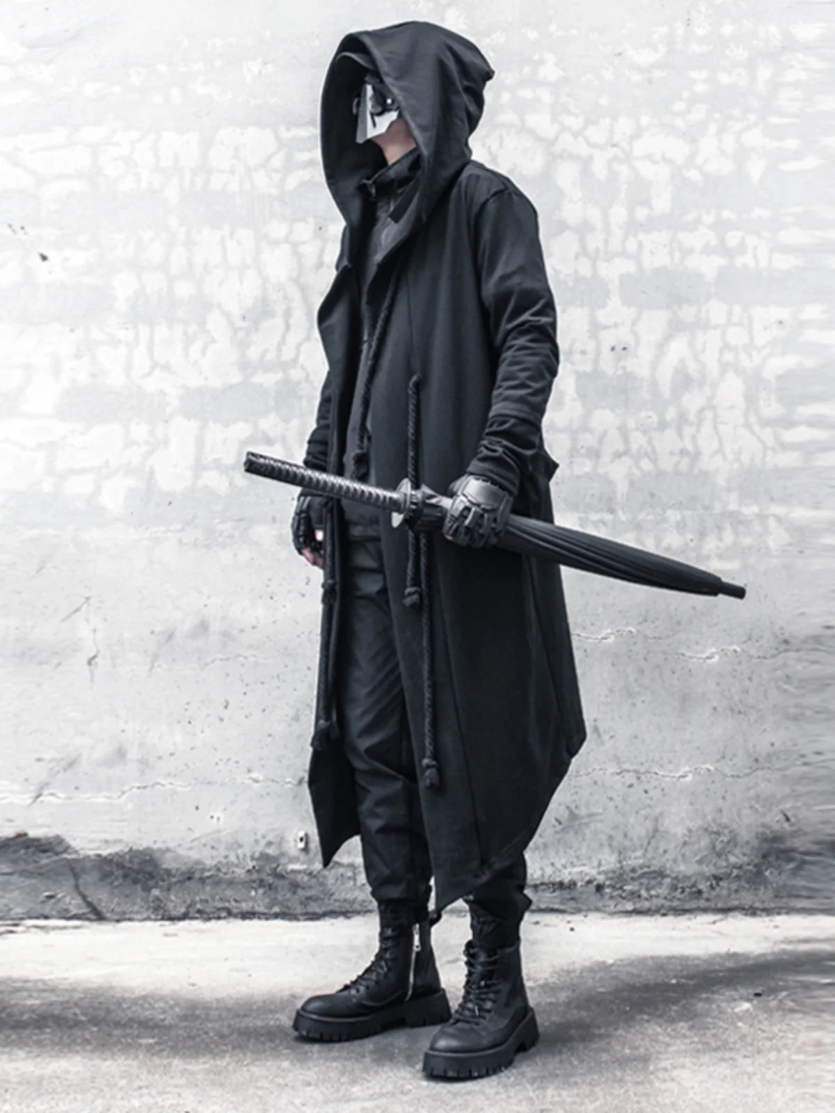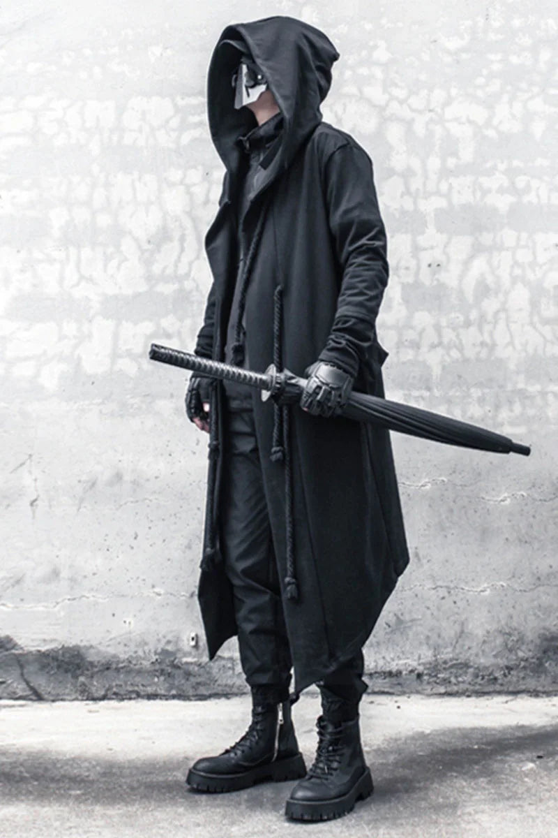 Cappotto lungo nero stile techwear da uomo con cappuccio