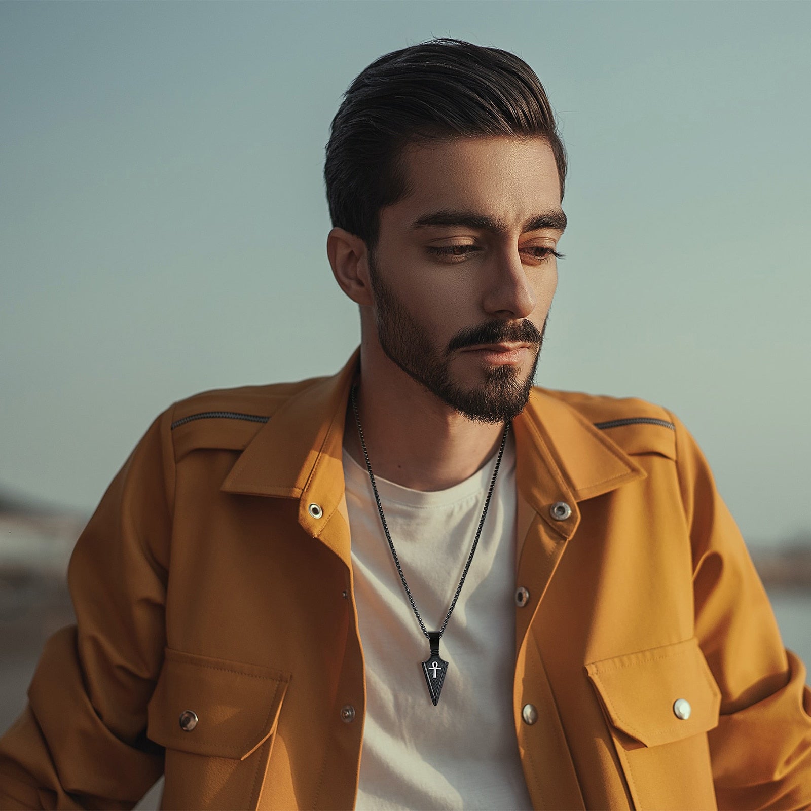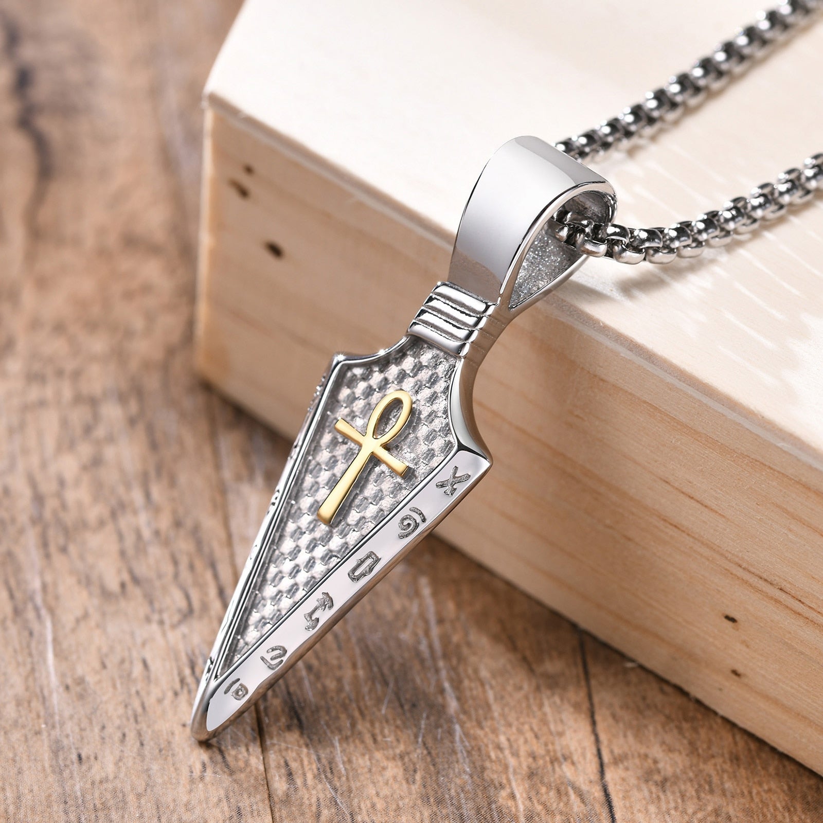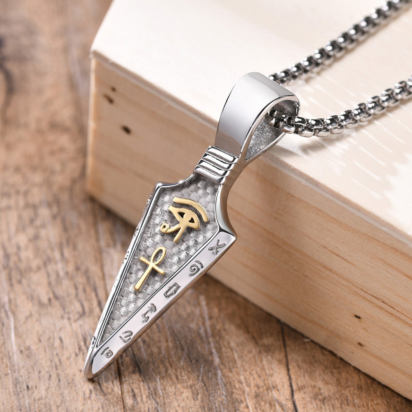 • Simbolo Mistico: La sua forma geometrica misteriosa lo rende molto più di un semplice gioiello. Questo pendente è ornato con un pendente a forma di lancia con l'occhio di Horus, aggiungendo un tocco esoterico al tuo look.