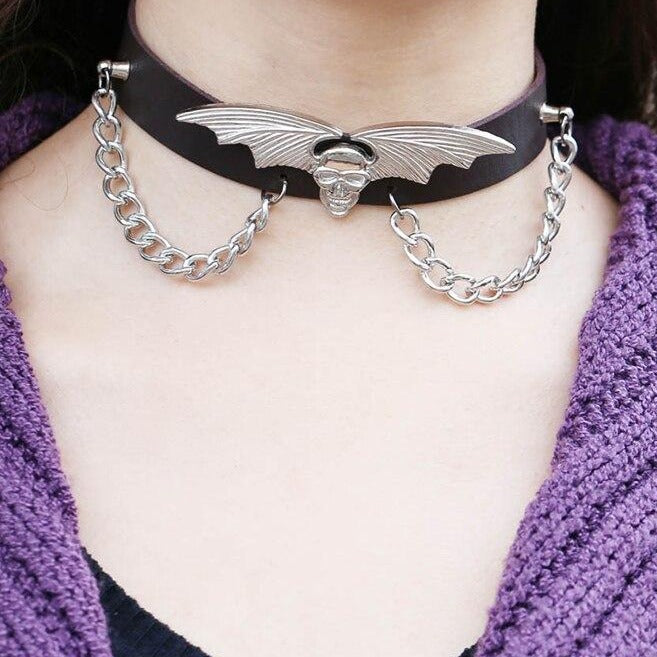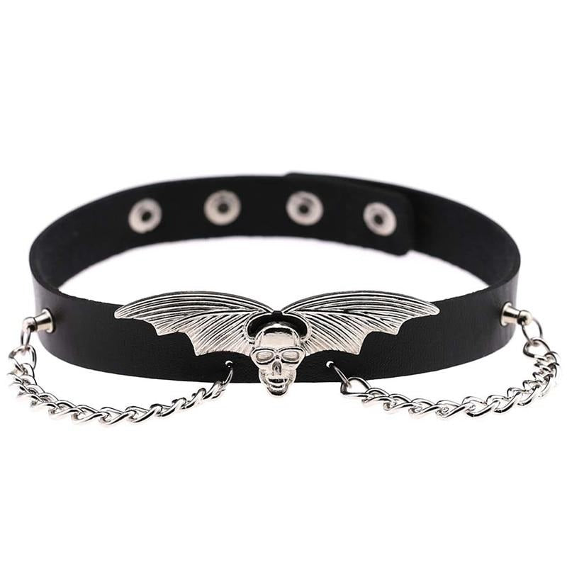 Per distinguersi dalla massa mantenendo uno stile unico e oscuro, questo collare è ornato da un pezzo di metallo scintillante che rappresenta un teschio alato. Il colore della fascia è nero per rimanere in coerenza con il movimento gotico ed essere visibile sul collo.
