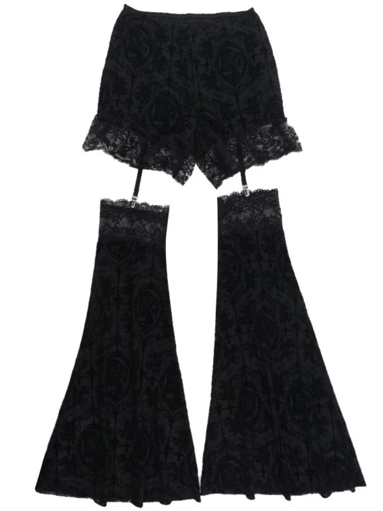 Pantaloni flare gotici neri in pizzo con gonna corta