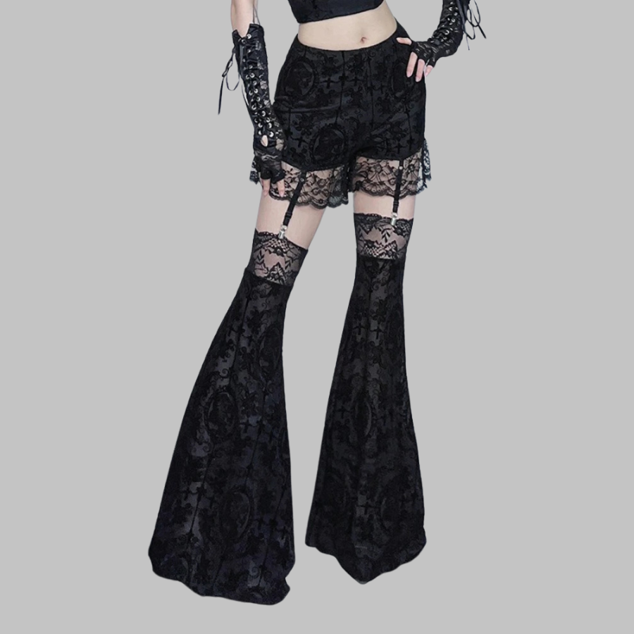 Pantaloni a zampa gotici neri in pizzo con gonna corta