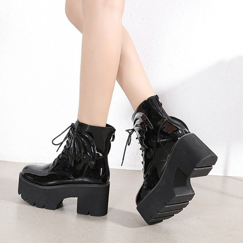 Le scarpe gotiche da donna in pelle sono costituite da similpelle vegana. Questo materiale imita meravigliosamente la pelle animale mantenendo una resistenza e impermeabilità ottimale.