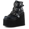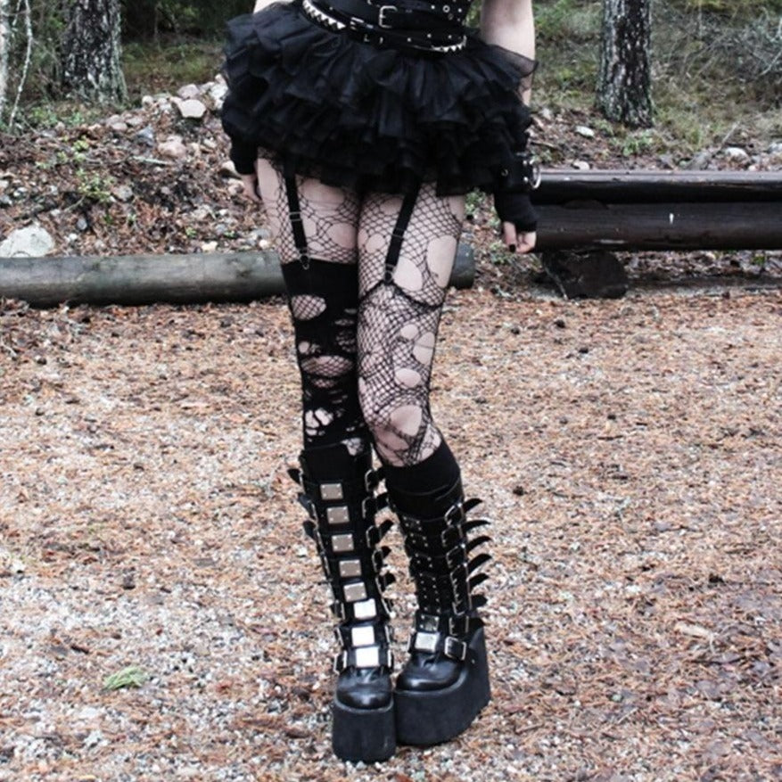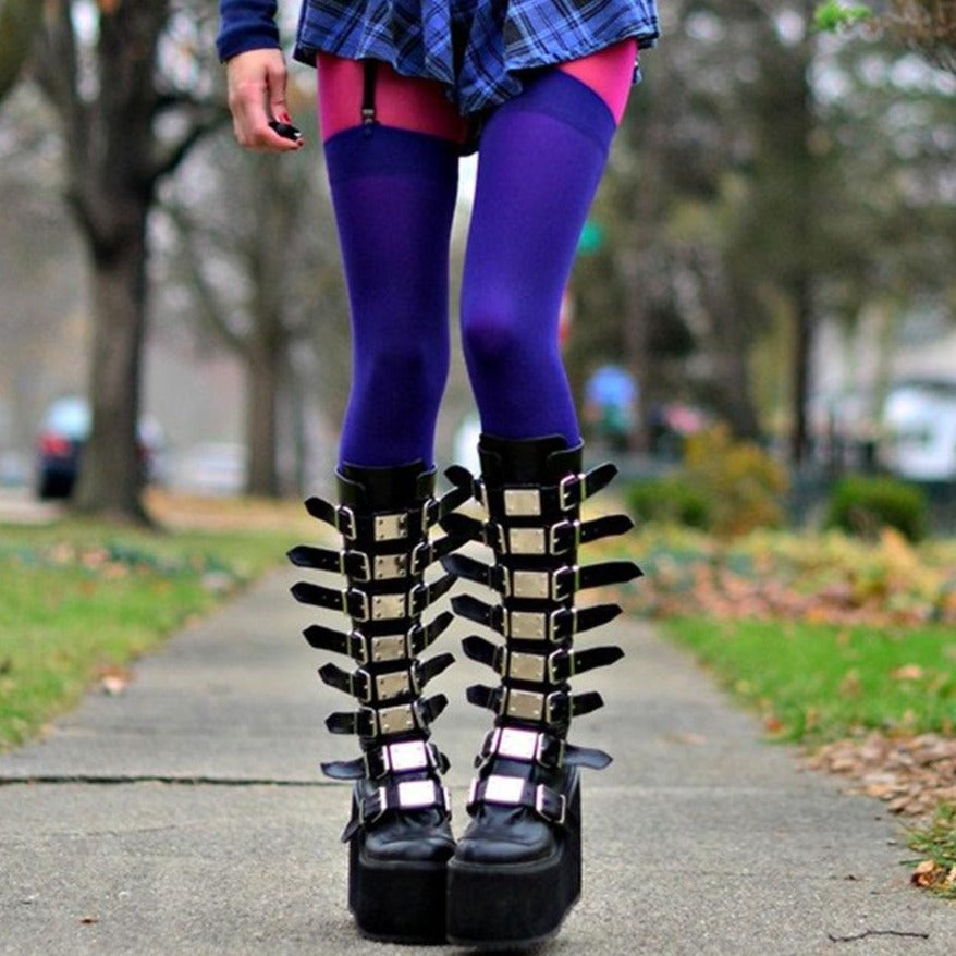 Dotati di molteplici cinturini con fibbie, gli stivali punk gotici non si muoveranno mentre cammini. Possiedono una suola alta in gomma nera che resiste nel tempo e permette di camminare su qualsiasi superficie senza alcun disagio.